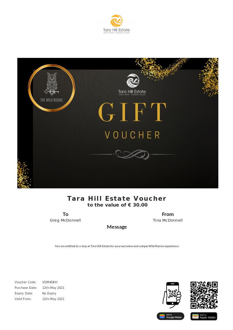 Tara Hill Estate allows you to purchase instantly printable gift vouchers, special offers and tickets using the Voucher Connect platform.